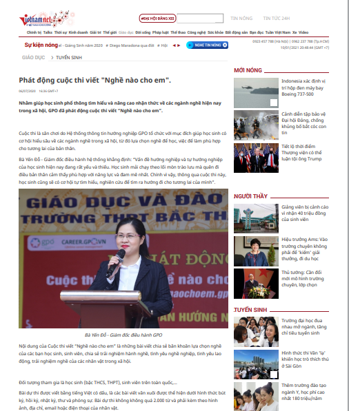 GPO – Grow People & Organizations - Hãng cung cấp các dịch vụ nhân sự trọn gói chuyên nghiệp bao gồm: (i) Dịch vụ Tuyển dụng cao cấp; (ii) Dịch vụ Đào tạo kỹ năng Quản trị doanh nghiệp, kỹ năng Quản lý, kỹ năng mềm và Số hóa nội dung đào tạo nội bộ; (iii) Dịch vụ Thuê ngoài (BPO – Business Process Outsourcing: nhân sự thuê ngoài, tính lương, quyết toán Thuế TNCN), (iv) Dịch vụ Tư vấn quản trị hệ thống nhân sự, xây dựng khung năng lực, lương 3P, hệ thống quản trị nhân tài; (v) Dịch vụ Tư vấn hướng nghiệp/du học cho học sinh, sinh viên và Quản trị sự nghiệp cho cá nhân có nhu cầu.